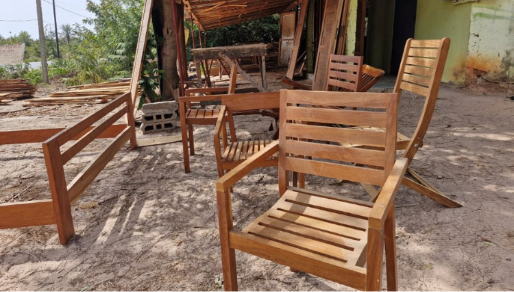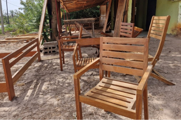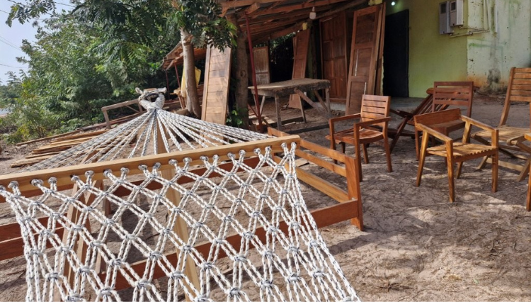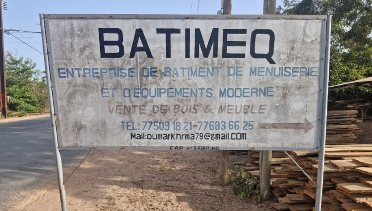 BATIMEQ est un atelier de menuiserie situé à Kabrousse, sur la route de Cap Skirring, en Casamance. Fondé et dirigé par Oumar, l’atelier intervient dans la fabrication de meubles et d’aménagements en bois local, principalement à partir du bois Dimb (Cordyla pinnata).