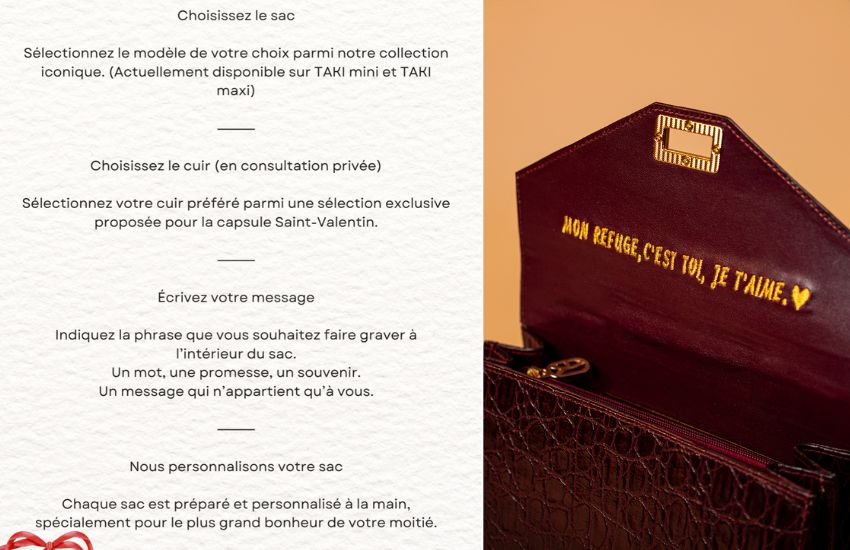La marque offre la possibilité de personnaliser certaines créations à travers une broderie réalisée à l’intérieur des sacs, ainsi que des pendentifs en cuir brodés, permettant d’y inscrire un message ou un mot intime.